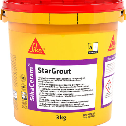 SikaCeram® StarGrout je dvokomponentna masa za fugiranje pločica, na bazi epoksidnih smola, za postizanje glatke i sjajne površine u raznim bojama. Idealna je za primjenu u područjima gdje se zahtijeva visoka čistoća. Kao masa za fugiranje - klasa RG po EN 13888. Kao ljepilo za pločice - klasa R2 T po EN 12004.