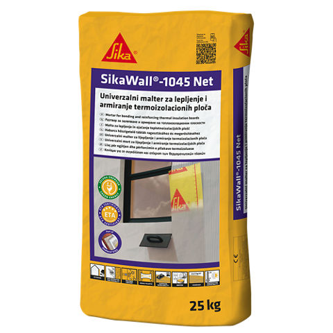 SikaWall®-1045 Net je gotova smjesa koja sadrži cement, pijesak određene granulacije, te odgovarajuće polimere i aditive. Nakon miješanja s vodom, postaje vrlo dobro obradiv malter, za lijepljenje termoizolacijskih ploča, kao i malter za ojačanje postavljanjem mrežice preko ploča. Klasificiran kao malter klase CS IV W2 prema EN 998‐1 za lijepljenje i kao malter za ojačanje i zaglađivanje termoizolacijskih ploča prema ETAG 004.